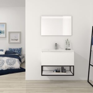 Pack compuesto por mueble de baño realizado con tablero de partículas laminado de 19mm alto brillo formado por una puerta con cierre suave. Lavabo sobreencimera cerámico blanco incluido. Espejo con iluminación led integrado incluido IP54,6000ºK,8,5W,920 lúmenes. Fabricado en España.